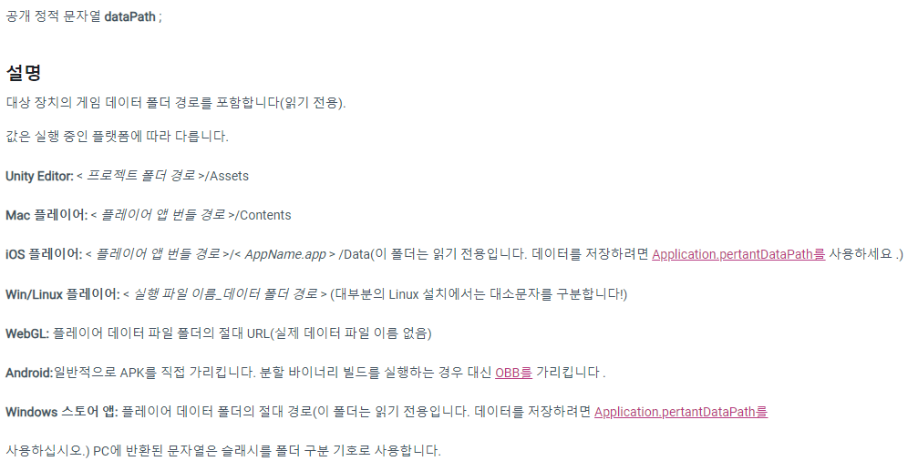 런타임 시에는 외부 파일이나 저장소 경로에 접근할 때 Application.persistentDataPath를 사용하는 것이 일반적